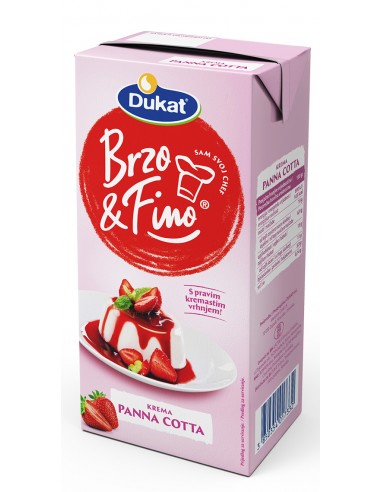Nova linija Brzo & Fino gotovih svježih krema s vrhnjem donosi tri kreme za omiljene slastice koje su gotove u tri jednostavna koraka i samo pet minuta. Zahvaljujući kremastoj teksturi i bogatom okusu slatkog vrhnja, Brzo & Fino krema panna cotta u samo tri jednostavna i brza koraka (ugrijati, složiti u željeni oblik i ohladiti) pretvara se u vaš najdraži desert – panna cottu.